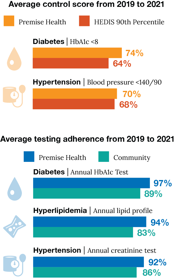 Premise-attributed primary care and pharmacy members consistently saw better adherence to testing guidelines and disease-specific clinical outcomes. Members were more likely to adhere to testing standards annually were able to gain more control over their conditions all three years.
