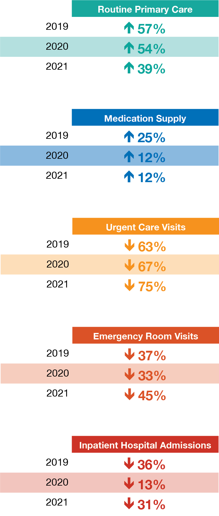 A byproduct of increased access to regular preventive care and medication, Premise-attributed members in turn utilized urgent care and emergency room services less and saw fewer inpatient admissions when compared to community-attributed members.