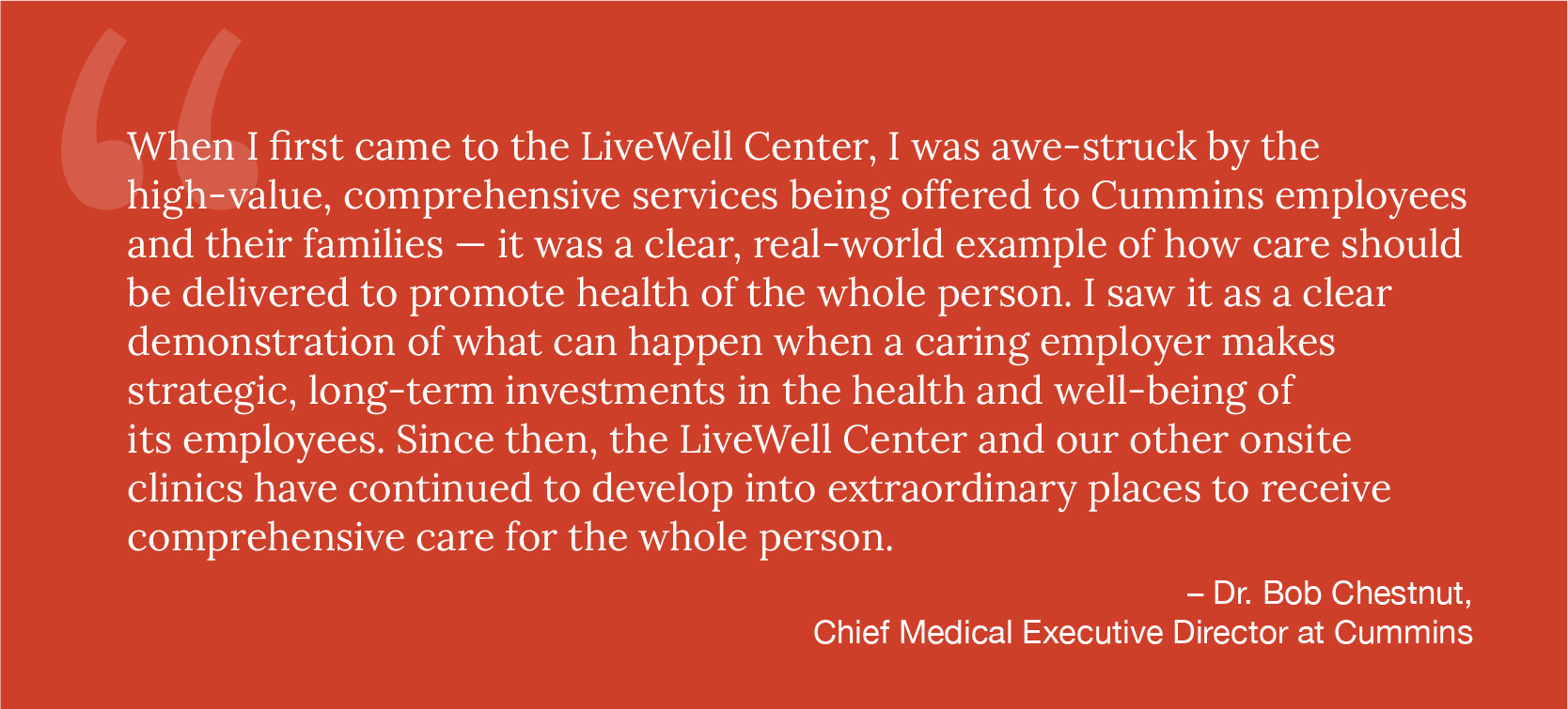 With 30,000 employees in the U.S. alone, their workforce crosses many cultures, demographics, roles, and backgrounds. Cummins recognized that a diverse workforce has diverse needs and sought to create a tailored healthcare experience for their employees. To create this experience, Cummins and Premise Health, partners since 1999, decided to go all-in on whole-person healthcare designed to serve their members — mind, body, and spirit. In 2016, they launched the LiveWell Center for their Columbus, Ind. employees, a comprehensive wellness center with a patient centered medical home model of primary care and a big mission: to reimagine healthcare for Cummins employees.