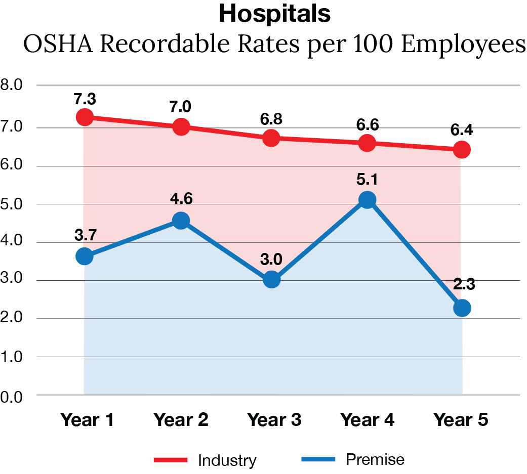 A study of Premise Health clients in the hospital industry found that those who partnered with Premise had recordable rates that were up to 65% lower than industry benchmarks within the first five years.2