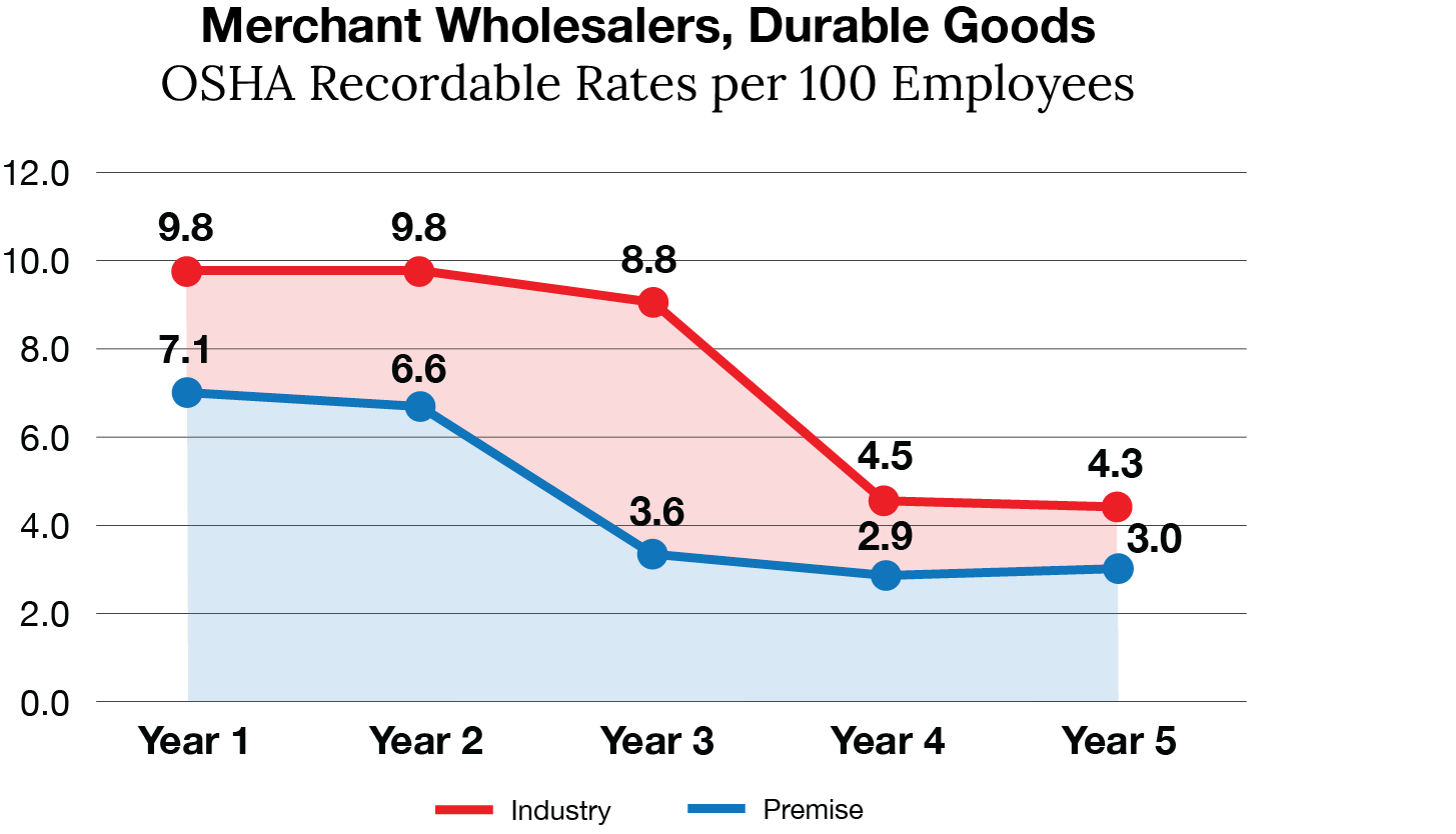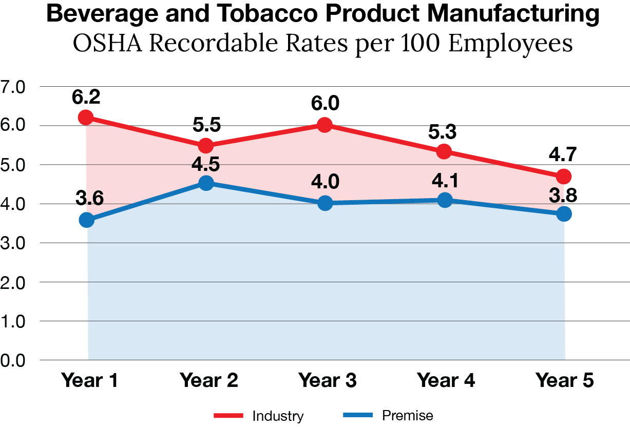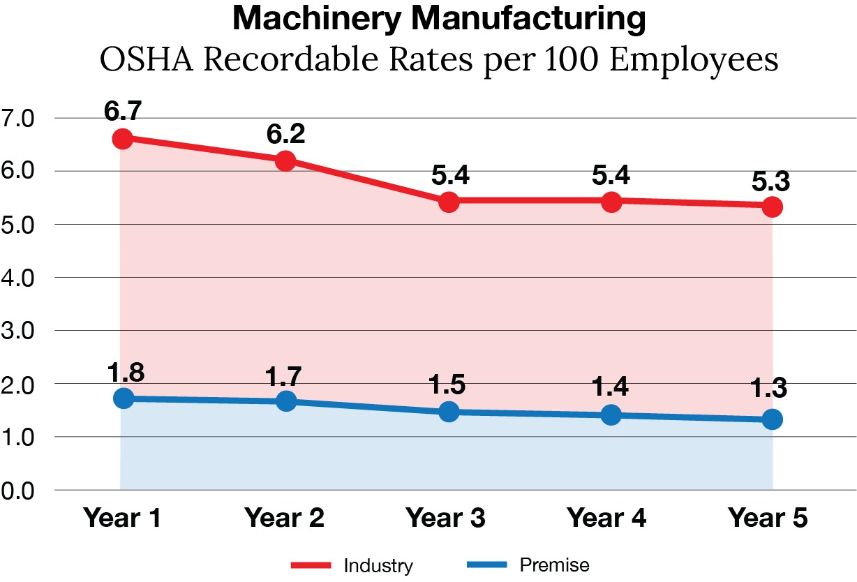 A study of Premise Health clients in the manufacturing industry found that those who partnered with Premise had recordable rates that were consistently lower than industry benchmarks3 in their first five years of operation.