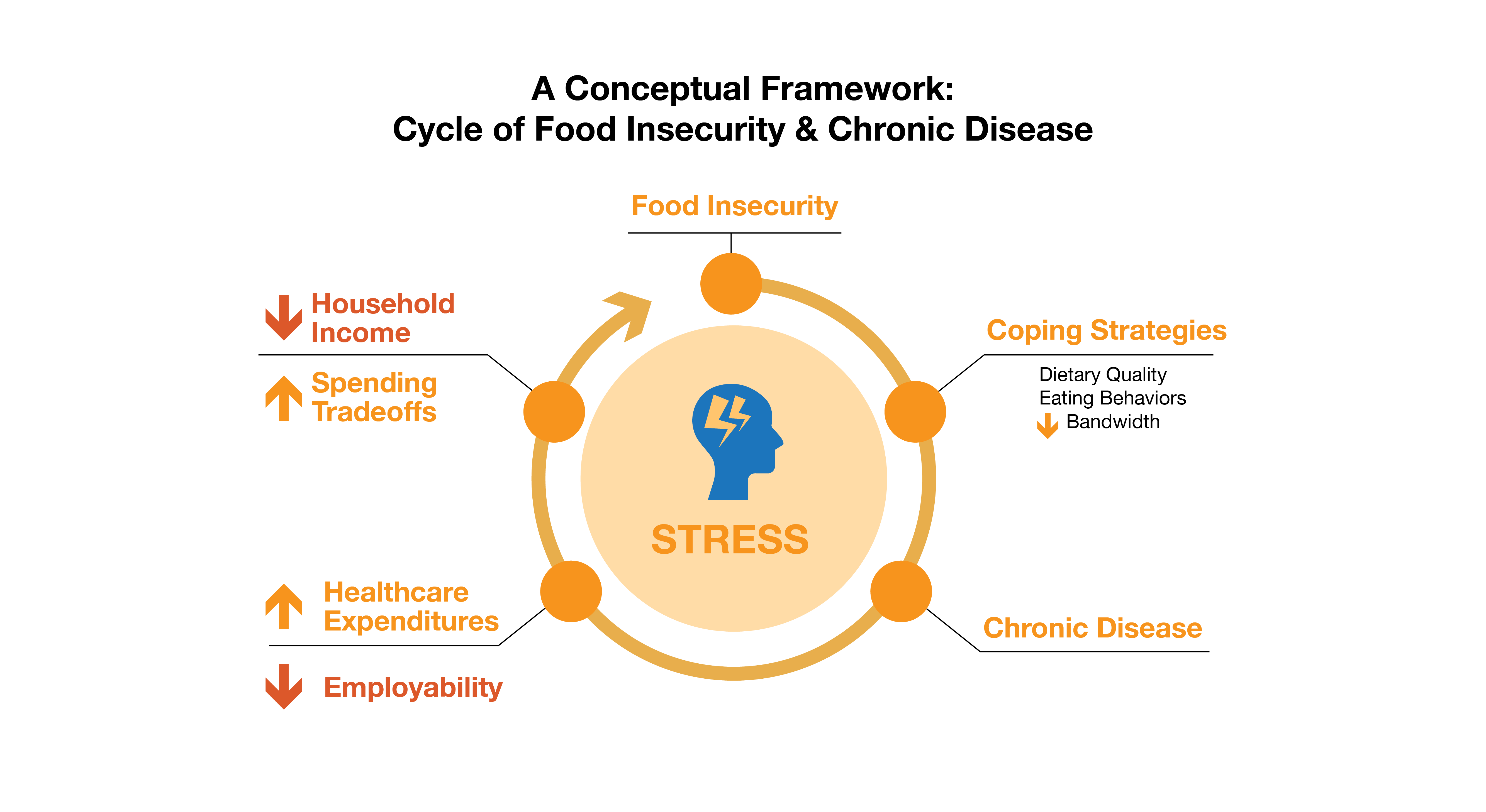Having access to healthy food is an important factor when thinking about someone’s overall health and wellbeing. According to the U.S. Department of Agriculture, food insecurity affects 11% of U.S. households, and this graph shows the dangerous cycle that can happen in those homes. Food insecurity invokes stress, which can in turn negatively impact a person’s health and even exasperate chronic conditions.