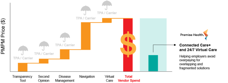 At Premise Health, we know that an integrated approach to care offers measurable cost savings. For example, we studied the cost implications of investing in our comprehensive Connected Care+ and 24/7 virtual care services vs. investing in point solutions for each of the included components. The results were clear. Premise Health delivers the greatest value to organizations and their people by offering one comprehensive approach that ensures members receive high-quality healthcare across the entire ecosystem.