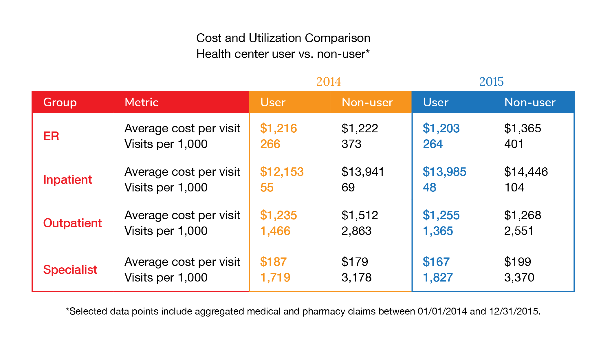 A variety of services were offered to enrolled members for free – including lab tests, radiology, counseling, lifestyle coaching, dietetics, and case management. Other services, including primary care, chiropractic, and massage therapy, were provided at a discounted rate of $10 per visit.