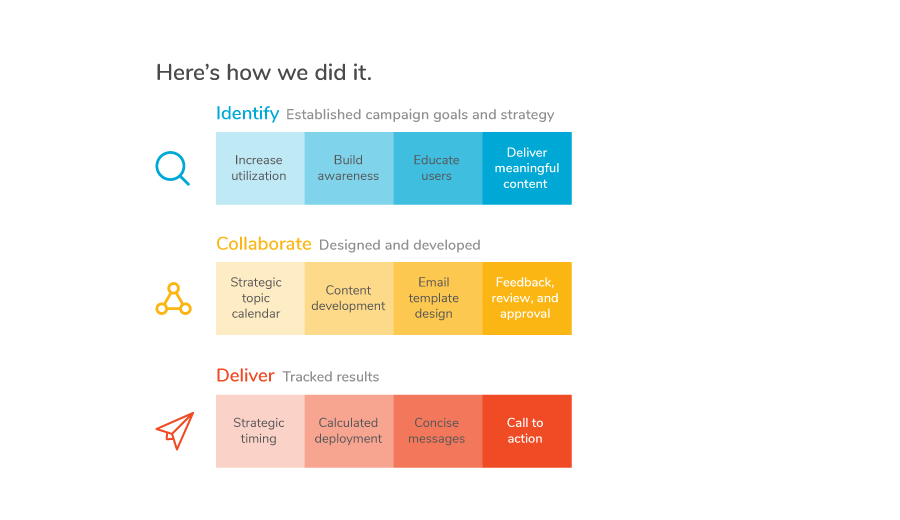 Each month featured a new topic and relevant call to action, based on the season, underutilized services, or client-promoted initiatives. Each campaign was designed to deliver timely, relevant content. Most importantly, the emails were trackable – so we could measure how interactions with the emails affected utilization.